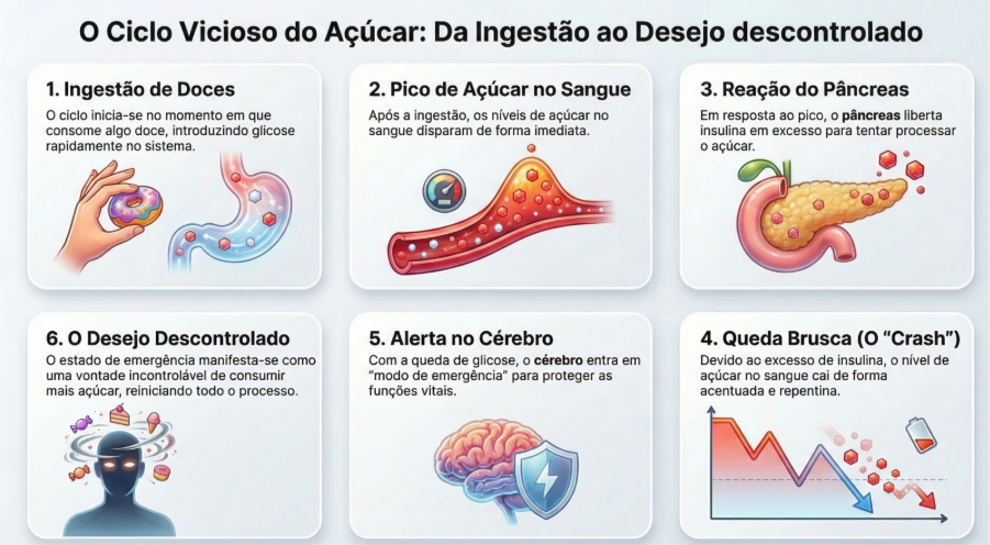 E há mais. O açúcar prende-o num ciclo vicioso: come algo doce → o açúcar no sangue dispara → o pâncreas liberta insulina em excesso → o açúcar no sangue cai bruscamente → o cérebro entra em “modo de emergência” → e aí vem o desejo descontrolado por mais açúcar. Não é você a escolher comer mais doces — é o seu corpo a tentar sobreviver à queda de energia.