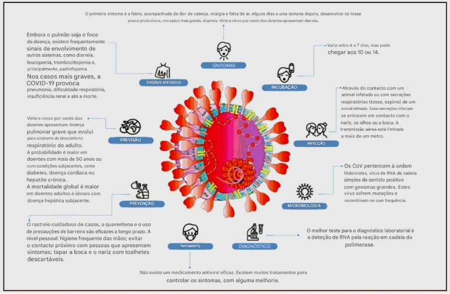 O SARS-CoV-2 é um coronavírus de RNA, semelhante aos que causam a SARS e a MERS, mas mais contagioso. A sua origem é animal, provavelmente em morcegos, passando para humanos através de intermediários. O vírus entra no corpo ligando-se a células dos pulmões, coração e outros órgãos, multiplicando-se rapidamente.